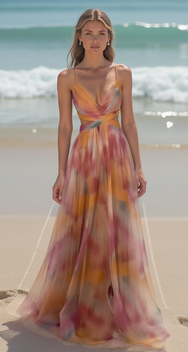 Con su diseño vaporoso y estampado acuarela, este vestido largo es ideal para destacar en bodas y cenas románticas, haciendo que te sientas única y especial.